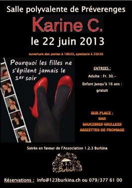 Spectacle de Karine C. "One-Women-Show" à Préverenges le 22 juin 2013 – Bénifice redistribué à 1.2.3 Burkina.