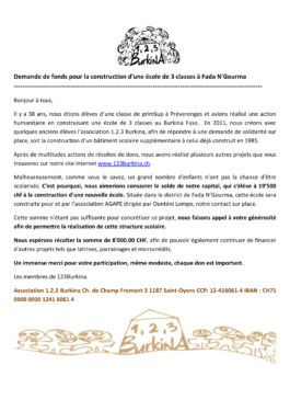 En février 2011, à l’occasion de retrouvailles, les discussions concernant l’école de Nienduga vont bon train : il s’agit de la compléter par une nouvelle construction conforme à la nouvelle législation burkinabée. De plus, le bâtiment existant va probablement devoir être reconstruit ou du moins rénové. Les anciens élèves décident de relever une nouvelle fois le défi afin de continuer à permettre à de nombreux enfants burkinabés d’avoir accès à un droit fondamental : une scolarisation de base.